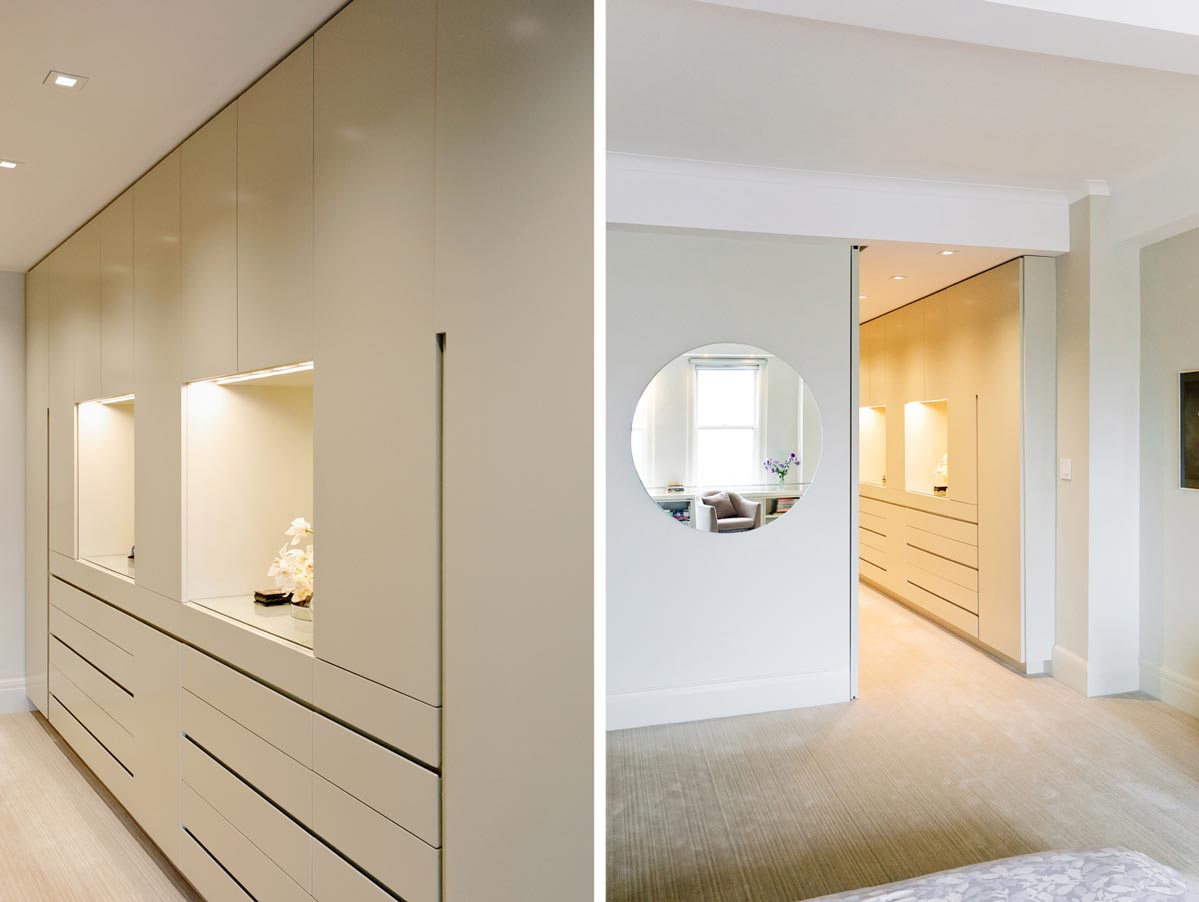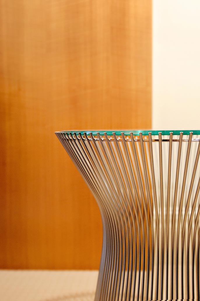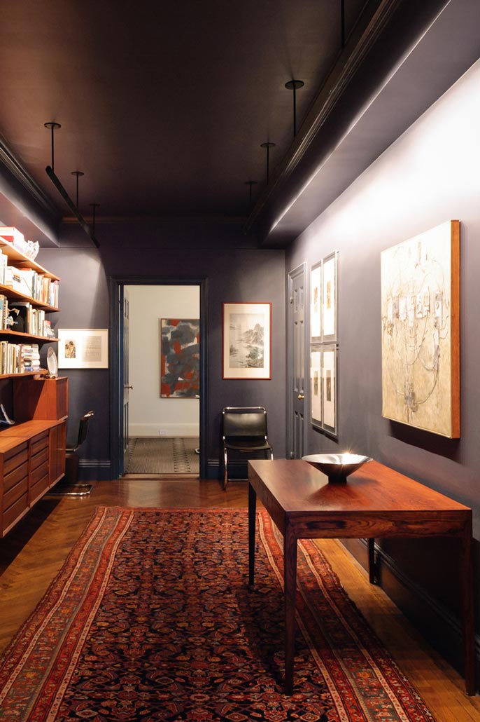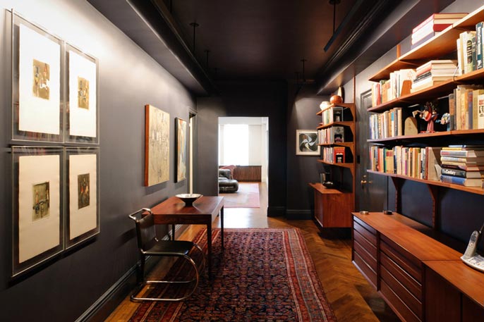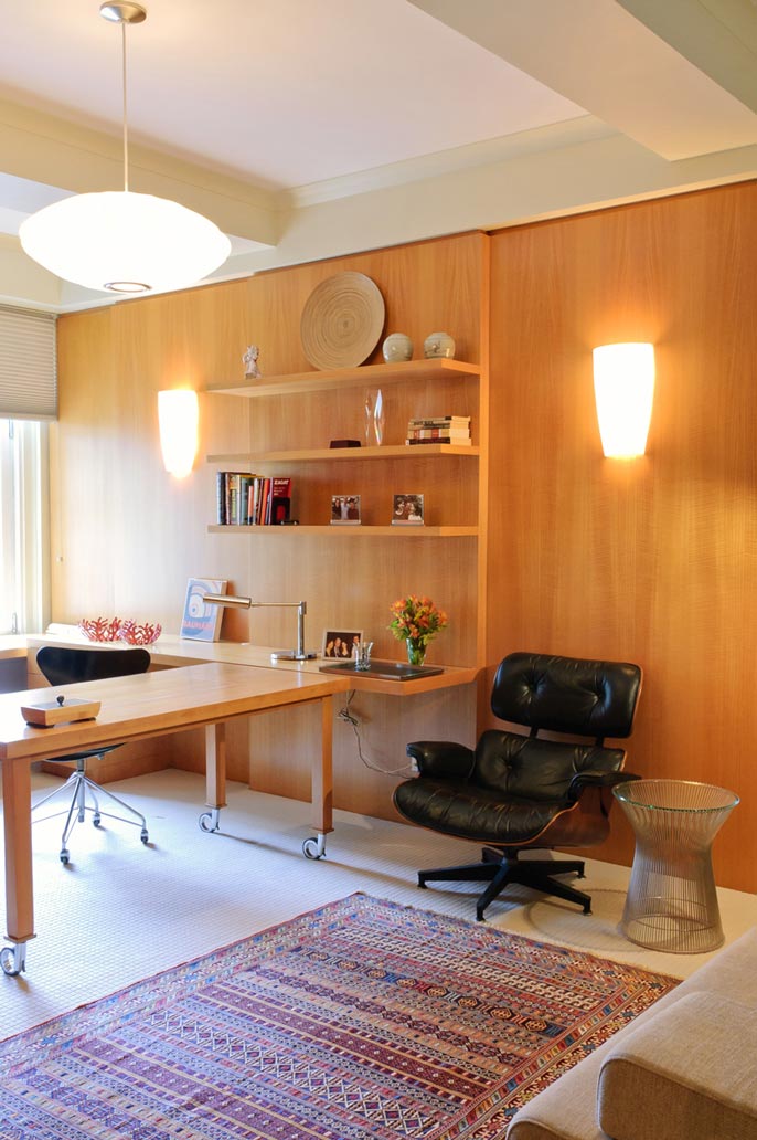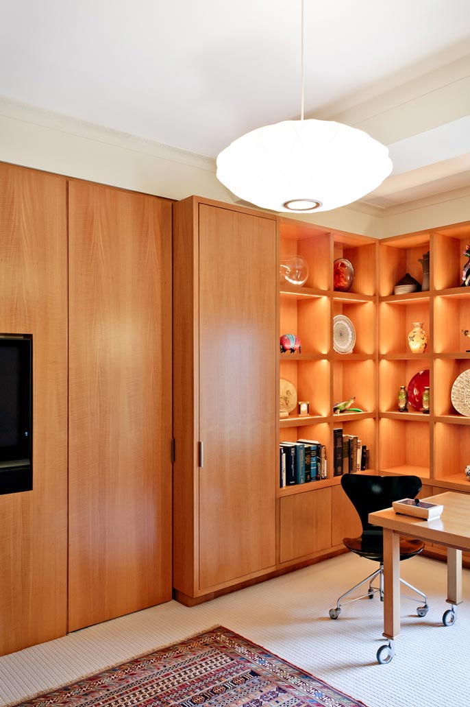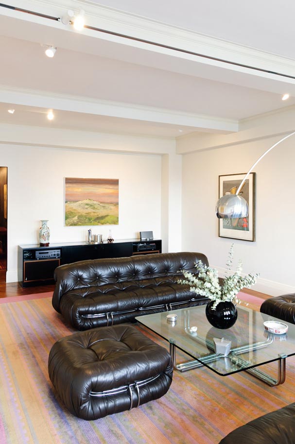 The apartment, located in one of Central Park Wests’ most elegant prewar buildings with stunning views over the planetarium, belongs to a couple with a respectable commitment to collecting modern furniture and art. The modifications and renovations showcase the masterful structure and layout of the building with elegant materials, clean details and careful placement of lighting. The beautifully engineered Bulthaup kitchen integrates seamlessly with the owners collections turning the spaces into a cozy residential haven with the feeling of being at an exhibit.
