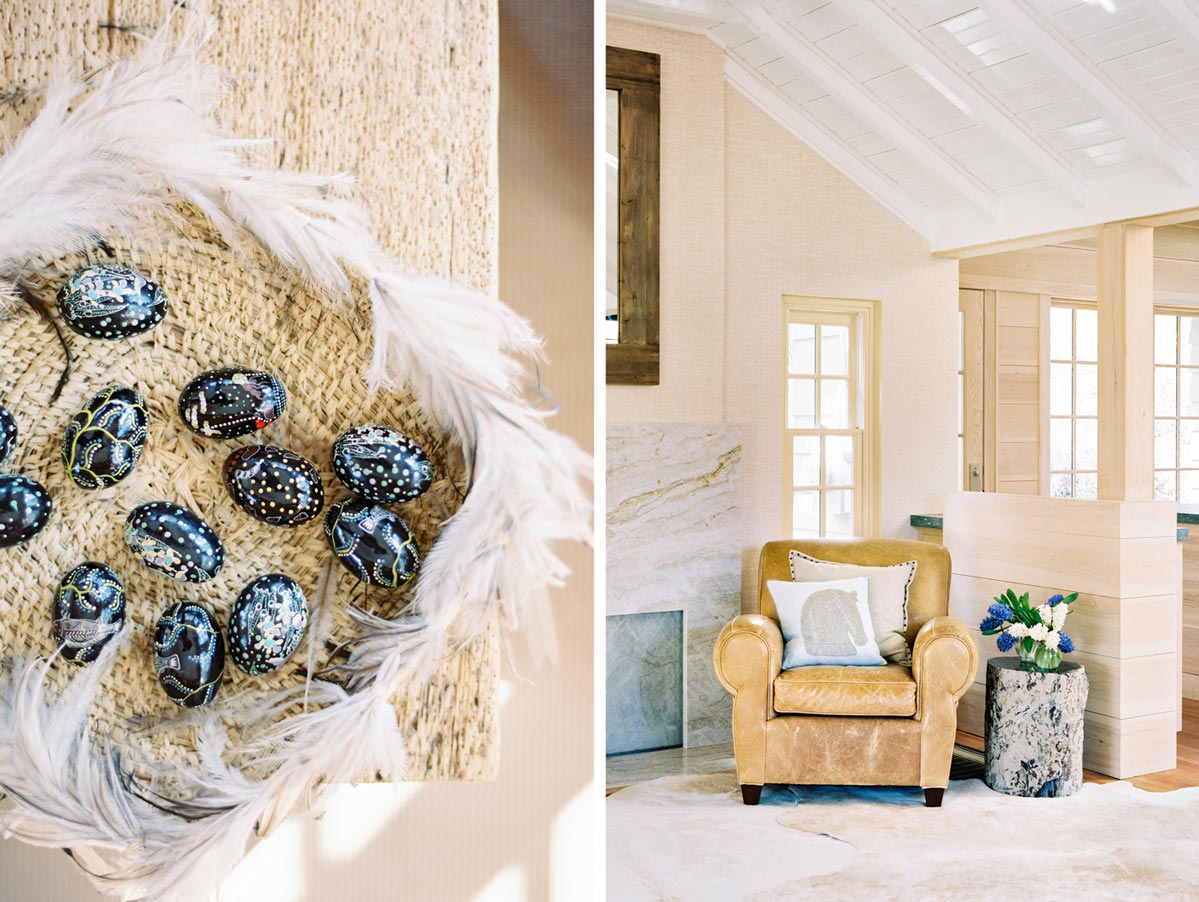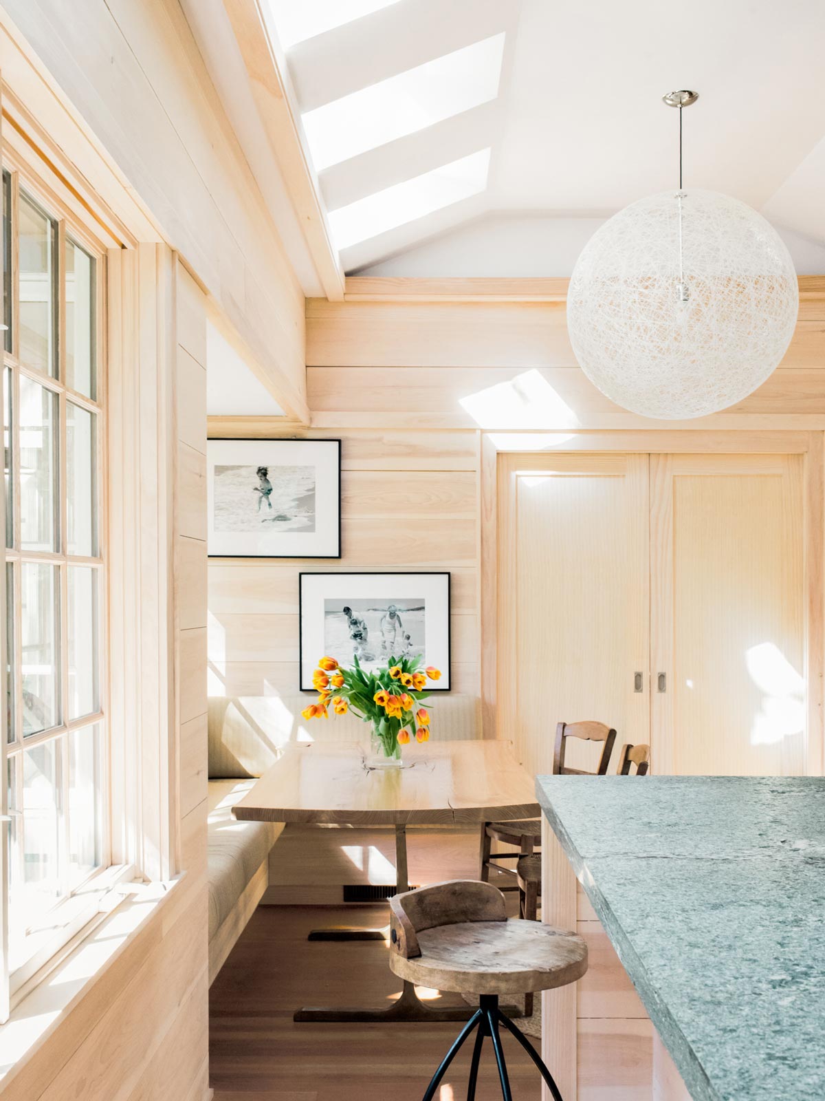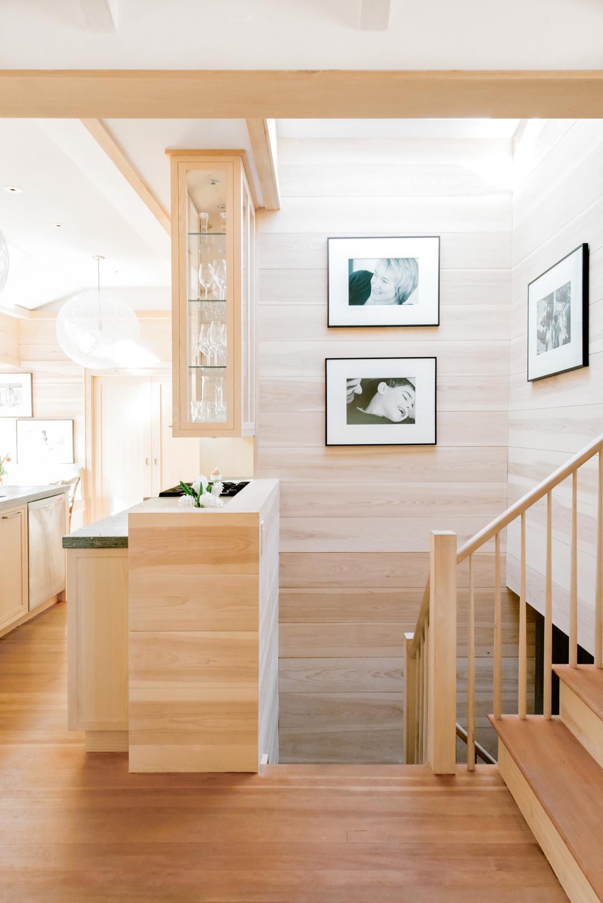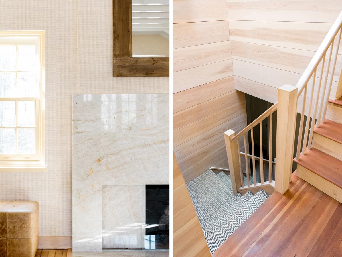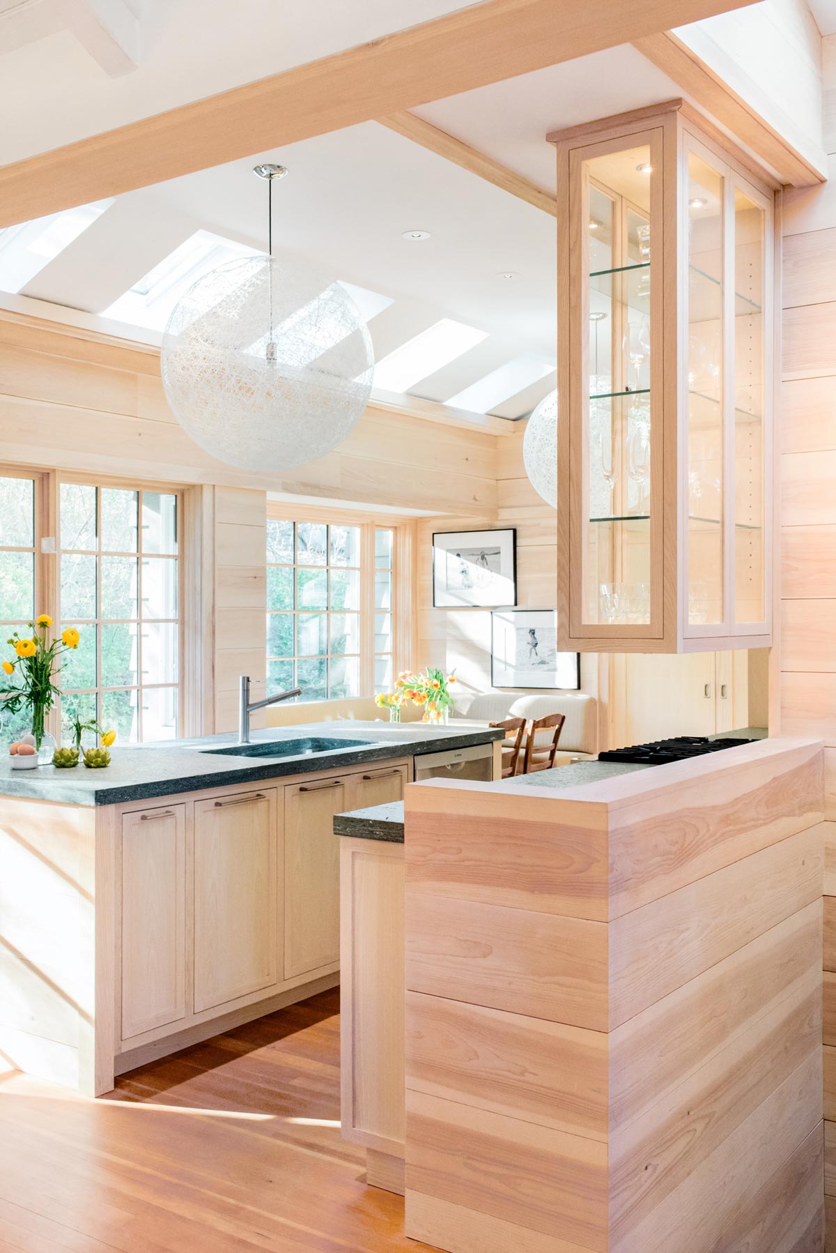 This informal cabin in the woods suffered from dark and poorly constructed thoughtless additions over the years. The need for handicap access precipitated the expansion and re-arrangement of the circulation and rooms starting with a new skylight over the refurbished stairway. The bedrooms, bathrooms, kitchen, living and entry areas radiate from this light filled central core. Horizontal clear pine planks finished with a specialized wax and stain system negate oxidation, offer brightness and coordinate with the antique pine paneling in adjacent areas to perpetuate the cozy wood cabin ambience. Custom Ash cabinetry, rustic stone slabs and a refined use of natural materials and calm palettes are employed throughout the project.