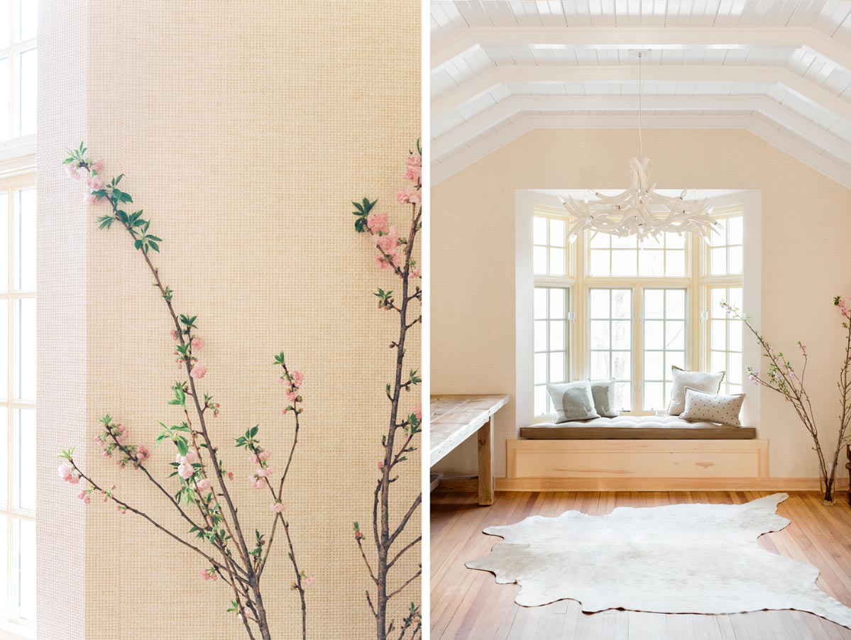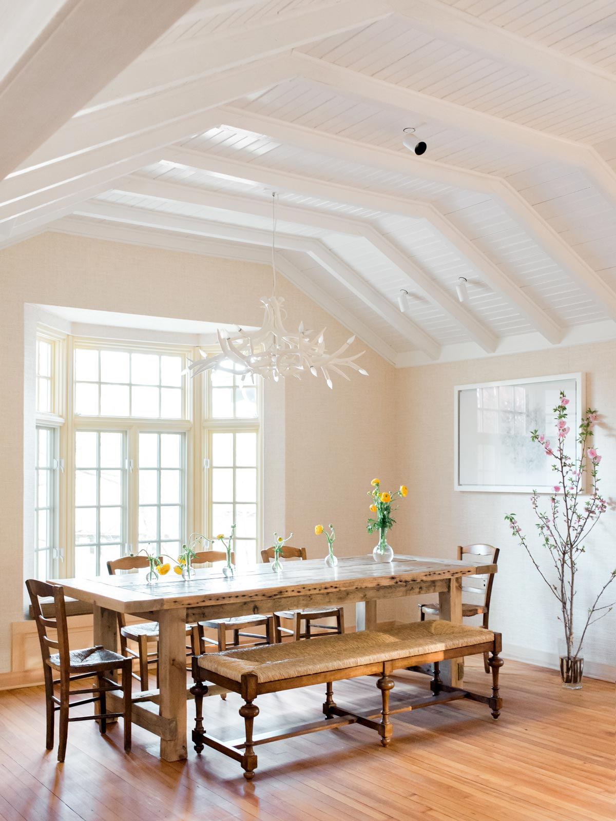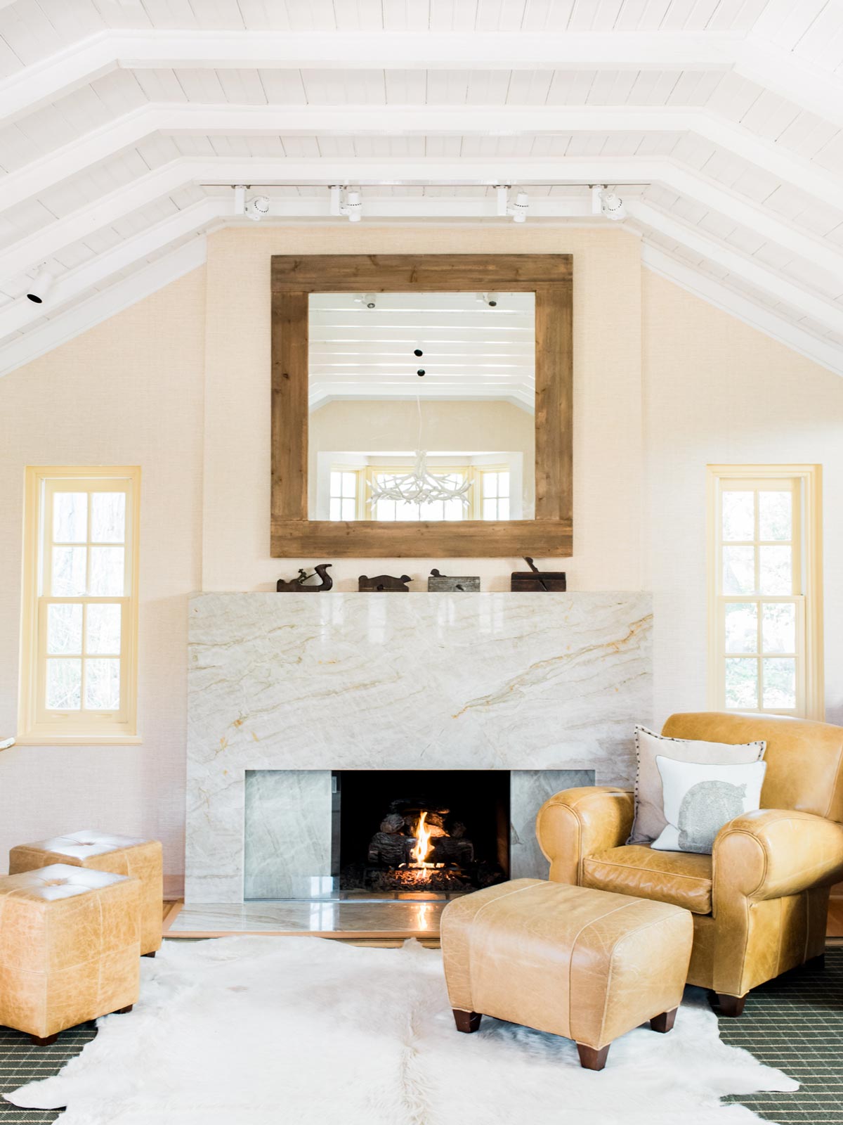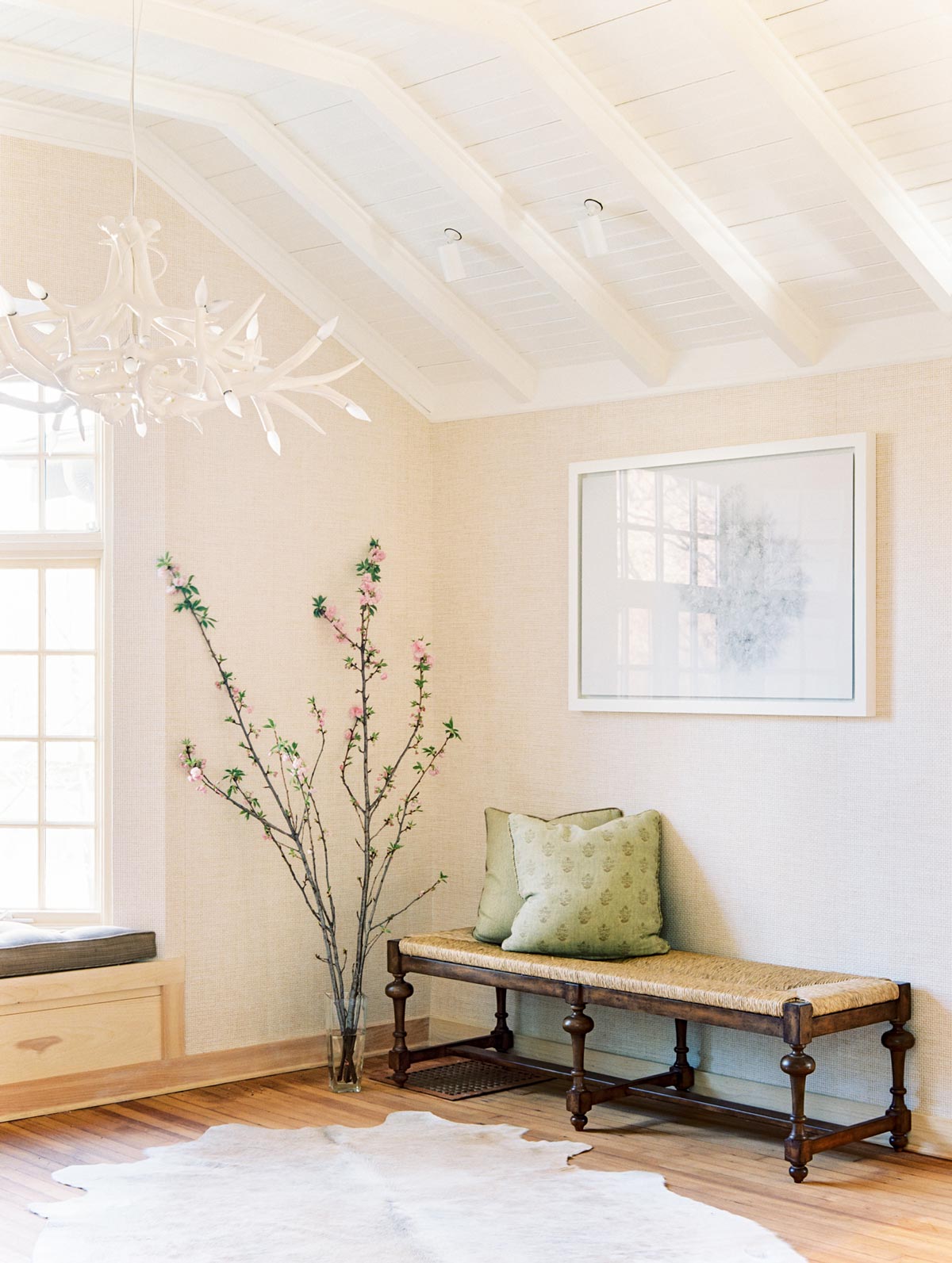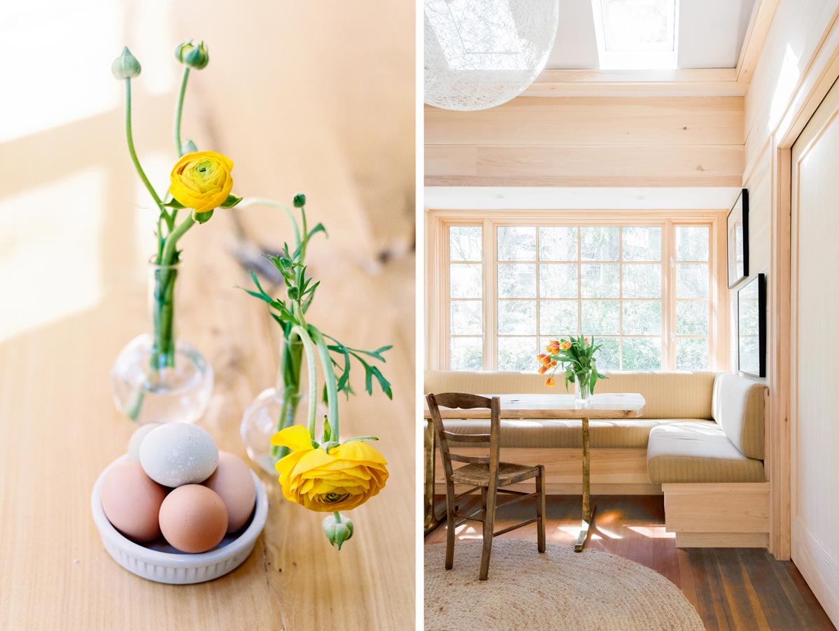 This informal cabin in the woods suffered from dark and poorly constructed thoughtless additions over the years. The need for handicap access precipitated the expansion and re-arrangement of the circulation and rooms starting with a new skylight over the refurbished stairway. The bedrooms, bathrooms, kitchen, living and entry areas radiate from this light filled central core. Horizontal clear pine planks finished with a specialized wax and stain system negate oxidation, offer brightness and coordinate with the antique pine paneling in adjacent areas to perpetuate the cozy wood cabin ambience. Custom Ash cabinetry, rustic stone slabs and a refined use of natural materials and calm palettes are employed throughout the project.