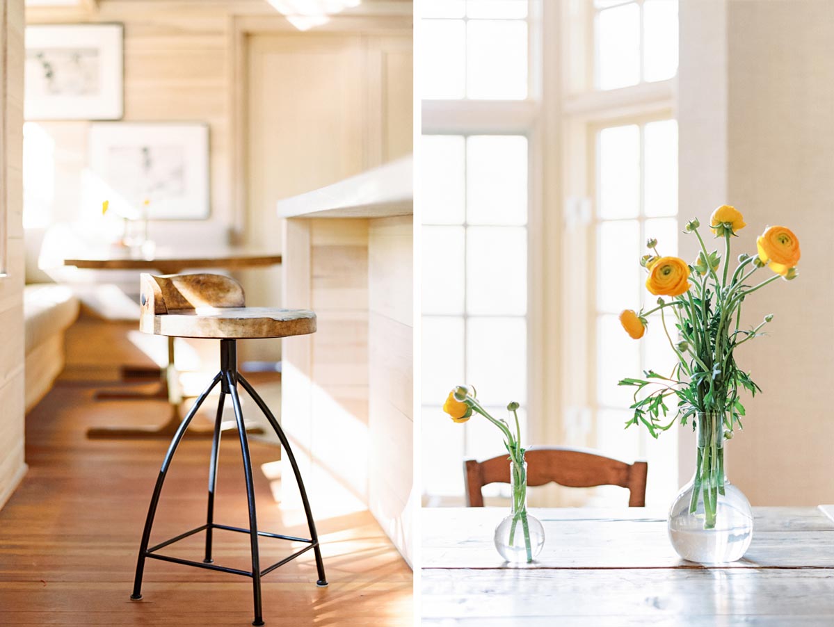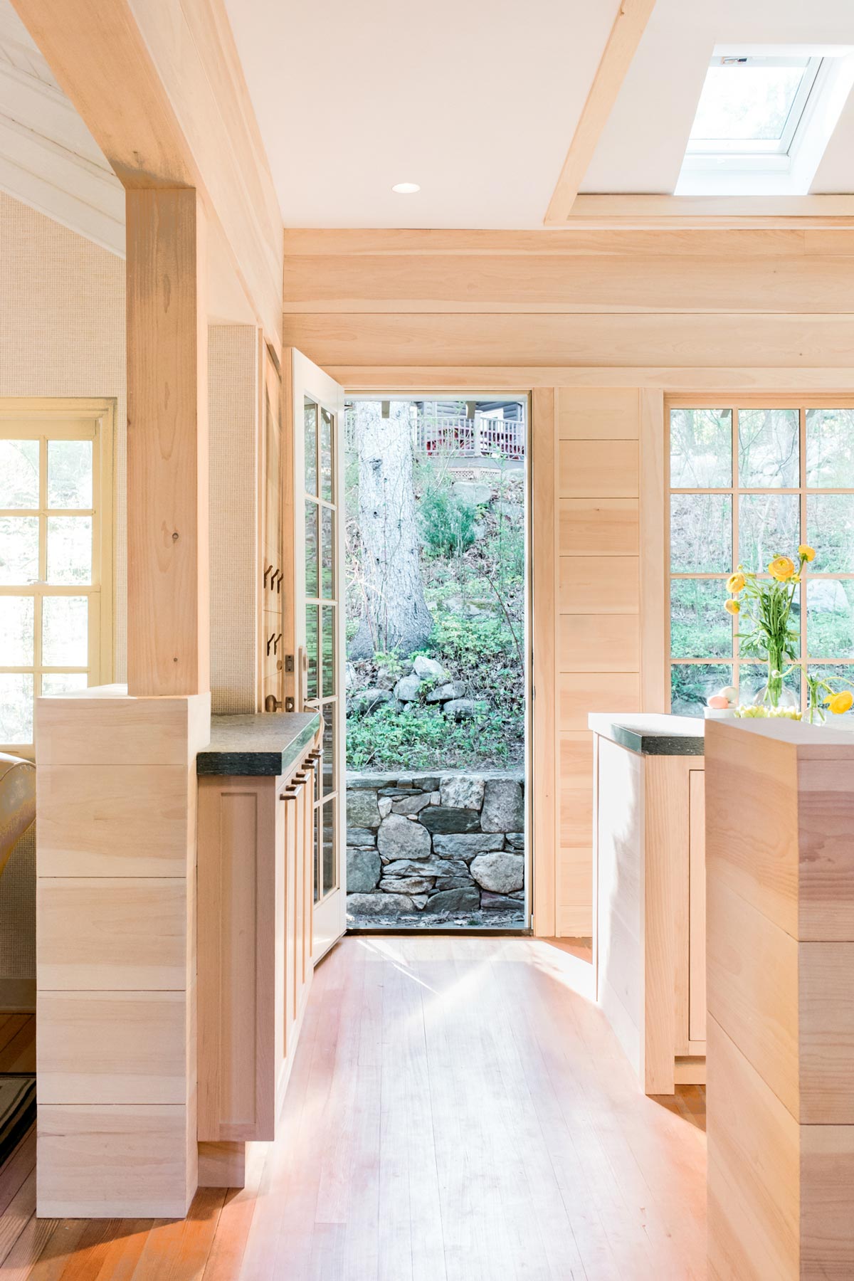 This informal cabin in the woods suffered from dark and poorly constructed thoughtless additions over the years. The need for handicap access precipitated the expansion and re-arrangement of the circulation and rooms starting with a new skylight over the refurbished stairway. The bedrooms, bathrooms, kitchen, living and entry areas radiate from this light filled central core. Horizontal clear pine planks finished with a specialized wax and stain system negate oxidation, offer brightness and coordinate with the antique pine paneling in adjacent areas to perpetuate the cozy wood cabin ambience. Custom Ash cabinetry, rustic stone slabs and a refined use of natural materials and calm palettes are employed throughout the project.